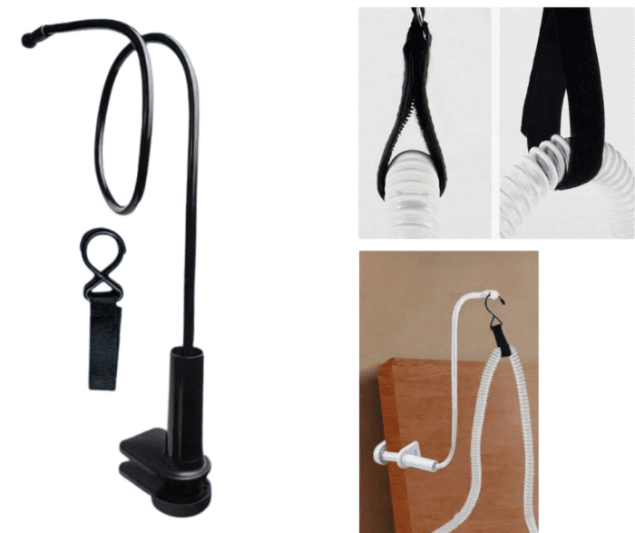 Držák na hadici k lůžku, zabraňuje zamotání, zabraňuje ucpání, udržuje vzduchovou hadici nahoře a mimo obličej a paže, což vám umožňuje klidnější spánek.